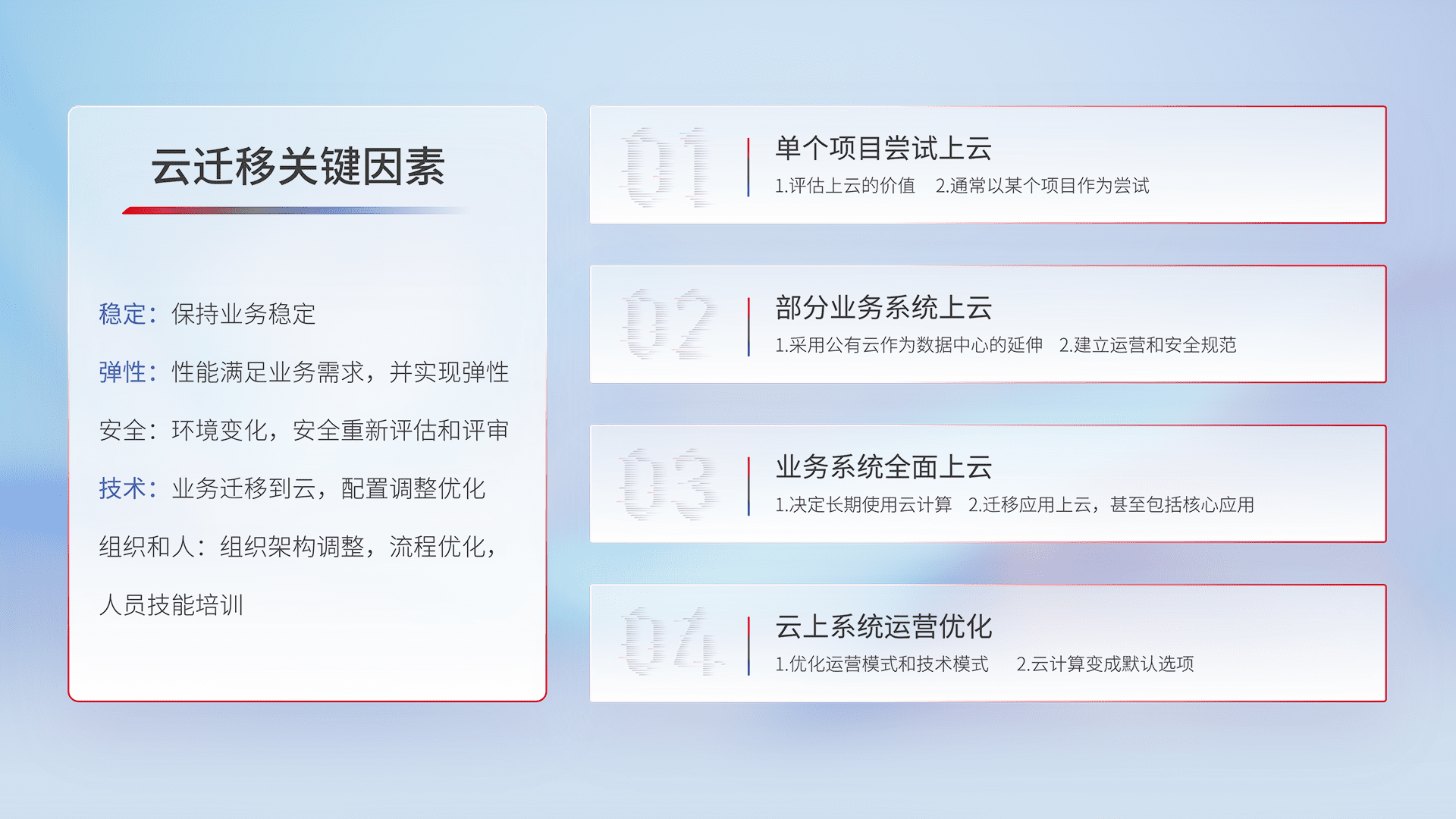 结合实际业务,,,,从规划设计、、、云平台选型、、云原生改造、、、、数据迁移、、、、集成交付,,,迁移全过程为客户识别最佳上云路径,,,做好风险识别管理,,,设计网络架构、、身份权限、、、、安全审计合规、、操作审计、、、日志审计、、、监控告警策略、、多站点容灾设计等,,对云上基础设施进行整体规划,,,提升IT治理水平,,,,以满足弹性、、、高可用、、、、高性能的需求。。。