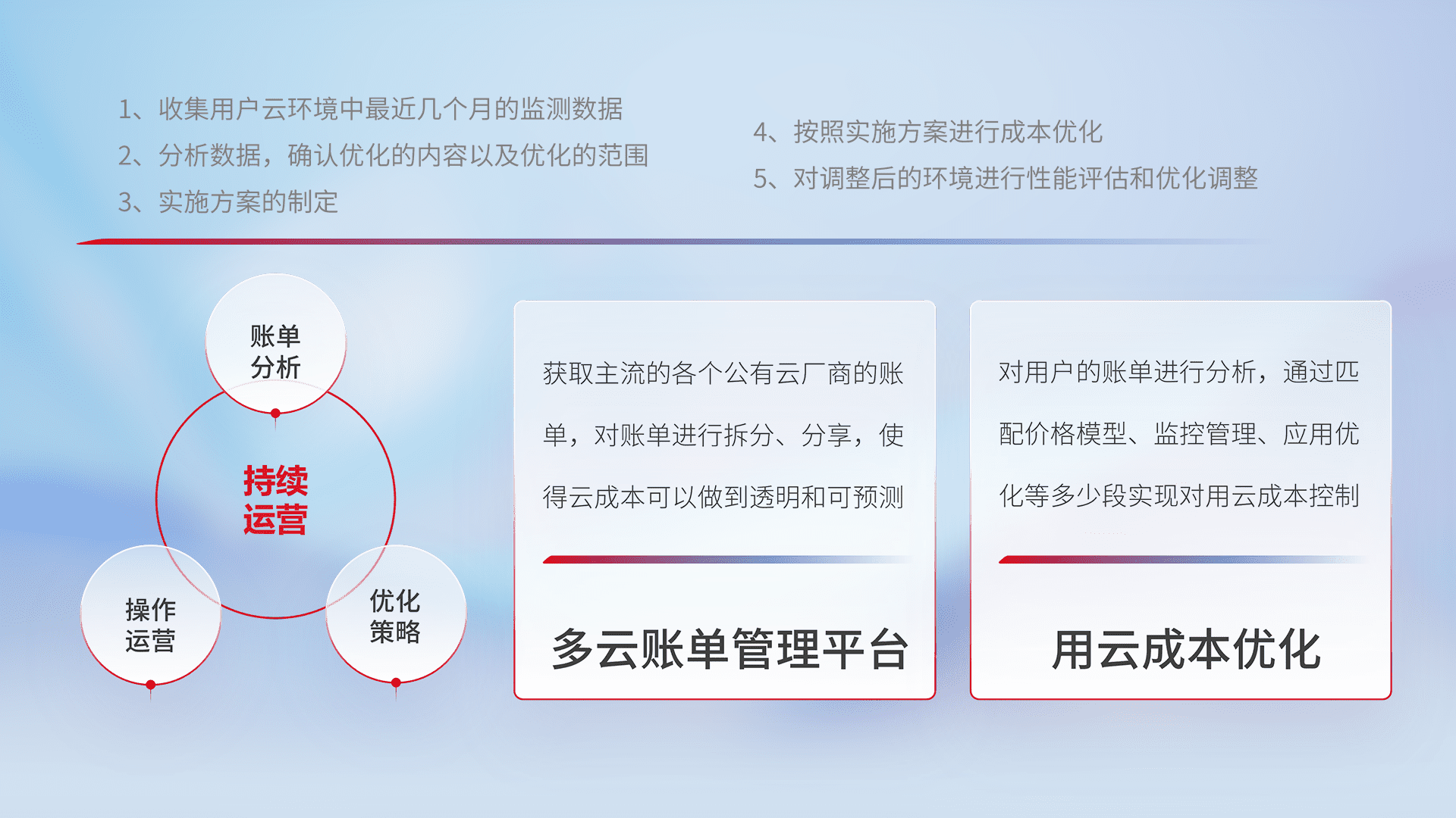 通过多云纳管,,,,以统一的资源数据模型把客户的云资源进行抽象和封装,,进而实现对多云资源的统一操作,,,保障云资源管理的可靠性、、、稳定性与可用性。。。。量身定制化运维内容,,,配置、、开发运维、、、、补丁管理、、、、备份、、、、监控、、、、认证和访问管理、、审计和日常巡检等,,,,保障在用云过程中的可靠度,,,,稳定度以及高可用率。。。。
